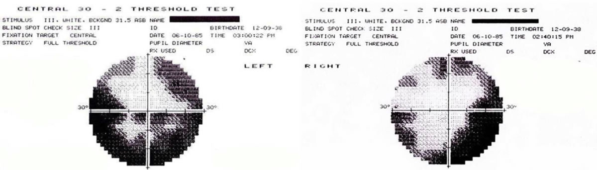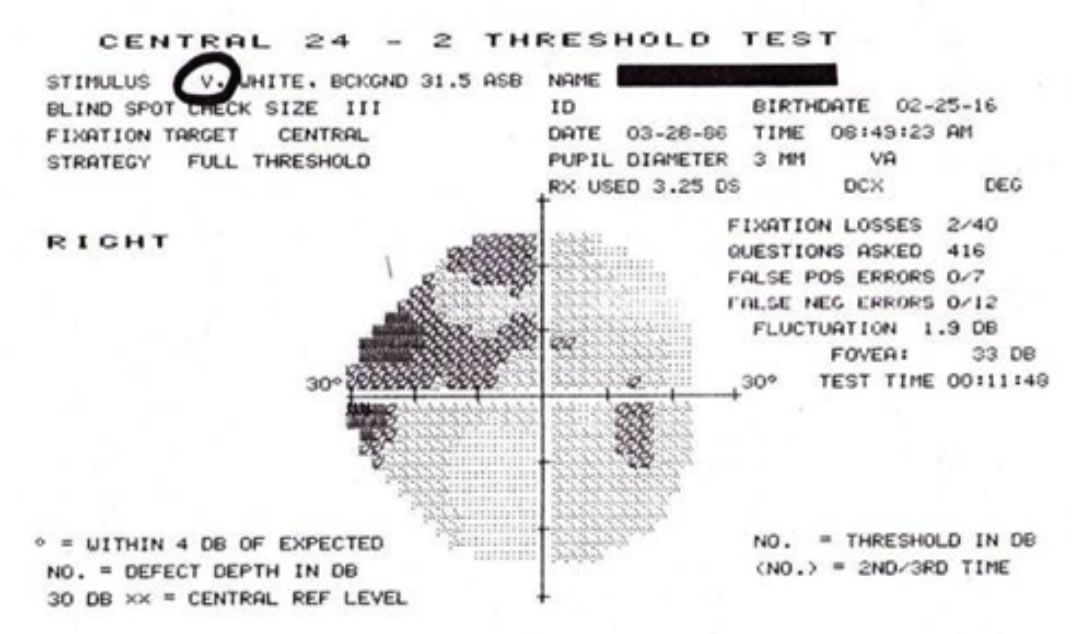 The test results (with or without the statistical analysis) are usually printed on one sheet called the printout (Figure 7). When examining the test results, you MUST hold the two printouts (right eye print out in your right hand facing your right eye, and left eye printout in your left hand facing your left eye), and examine them together (Figure 8).