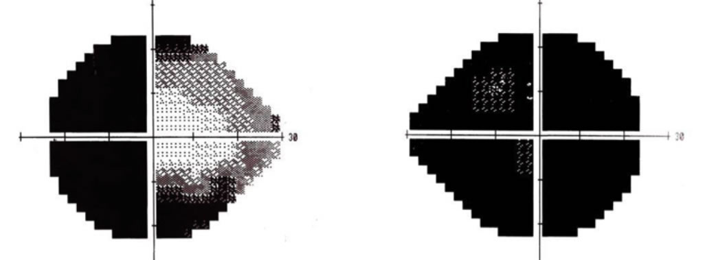 One of the most useful programmes, particularly in advanced glaucoma, is the central 10-2 programme. The test locations are 2 degrees apart, and a large number of points are crowded in the central 10 degrees. This gives a magnification effect, and shows the relationship between the central field defects and the point of fixation more precisely. This may reflect on the decision to operate or not, and helps with estimation of the risk of postoperative wipe-out (Figure 6).