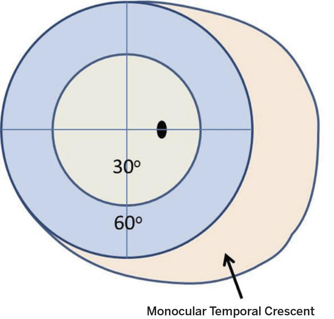 The plotted VF (the base of the cone) extends for approximately 60 degrees superior, inferior, and nasal and 100 degrees temporally. For practical purposes, the VF plot may be divided into three major parts: the central 30 degrees, the peripheral field (from 30 to 60 degrees), and the temporal crescent (Figure 2).