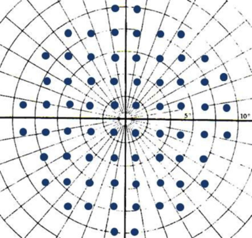 Static perimeters test the differential light sensitivities of specific retinal locations distributed on a fixed grid pattern. The spacing between these locations (points) varies according to the examination area targeted. When testing the central 30 degrees and central 24 degrees with the Humphrey perimeter, the grid points are spaced 6 degrees apart. The central horizontal points may be distributed on the horizontal axis (programme 30-1 or 24-1), or at equal distances from the horizontal axis (programme 30-2 or 24-2). The advantage of using the central 30-2 or 24-2 programmes lies in the spacing of the central horizontal points at 3 degrees from the centre of the field, with greater sensitivity to changes across the horizontal retinal raphé (nasal steps) (Figure 5).