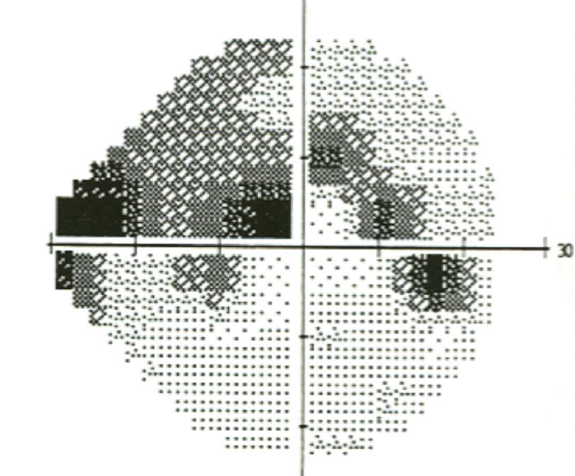 Bitemporal hemianopic defect due to chiasmal lesions. These can easily be confused with glaucoma, especially if the two pathologies coexist in the same patient (glaucoma plus pituitary tumour) (Figure 13).