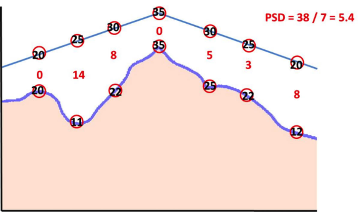 For practical purposes, the pattern standard deviation (PSD) reflects the degree of departure (difference) of the measured VF pattern (shape) from the normal hill of vision. A small PSD reflects a smooth uniform hill of vision, while a large PSD value reflects an irregular hill of vision (Figure 9).