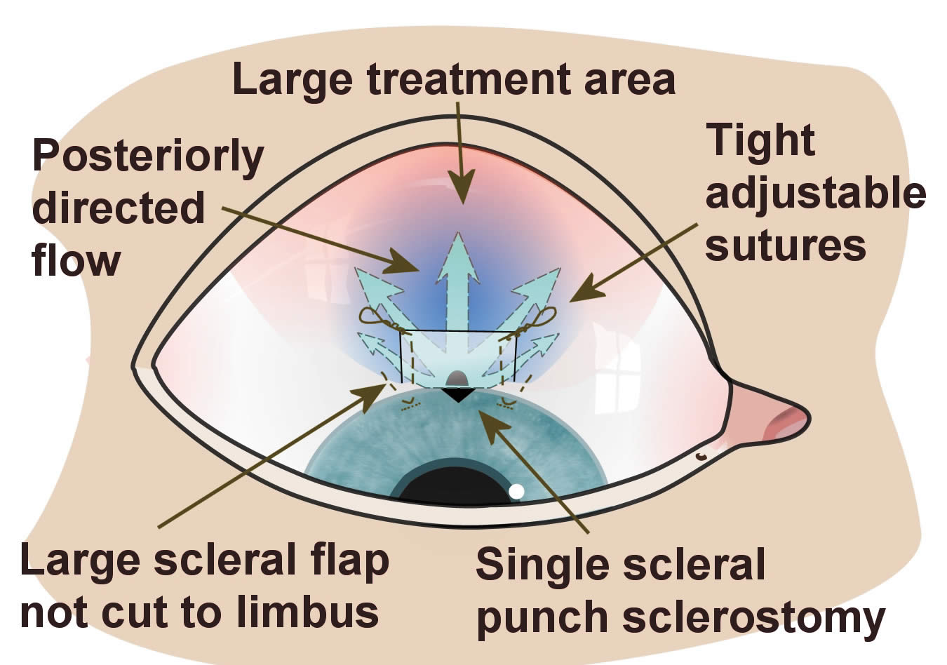 The use of the antimetabolites, 5-Fluorouracil (5FU) and Mitomycin-C (MMC), to prevent surgical failure has been the greatest advancement in glaucoma surgery over the last two decades. Single, intraoperative applicationBhas improved convenience of drug delivery. Strategies that change bleb morphology favourably are now available to avoid the development of focal, thin, avascular cystic blebs associated with antimetabolite use. These include a larger surface area of antimetabolite treatment,2 a fornix based conjunctival flap to reduce posterior restriction and a large scleral flap with closure that diverts aqueous posteriorly (Fig. 2). These simple modifications can achieve a much more diffuse, non-cystic bleb even with high dose antimetabolites (Fig. 3).