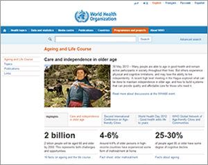 Special topics covered in depth on the website include: Elder abuse, Knowledge translation, Older persons in emergencies, WHO Global Network of Age-friendly Cities and Communities.
