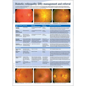 A3 size poster originally printed in the Community Eye Health Journal with a diabetic retinopathy (DR) grading system based on the International Council of Ophthalmology’s diabetic retinopathy and diabetic macular oedema disease severity scales.
