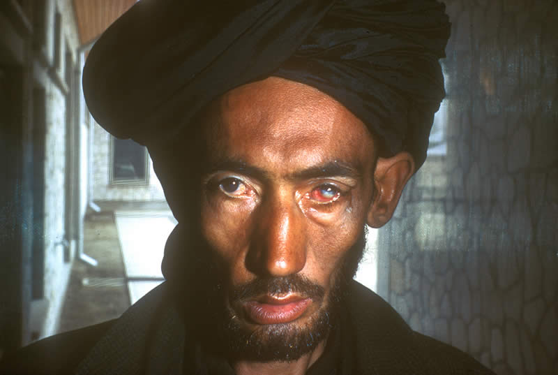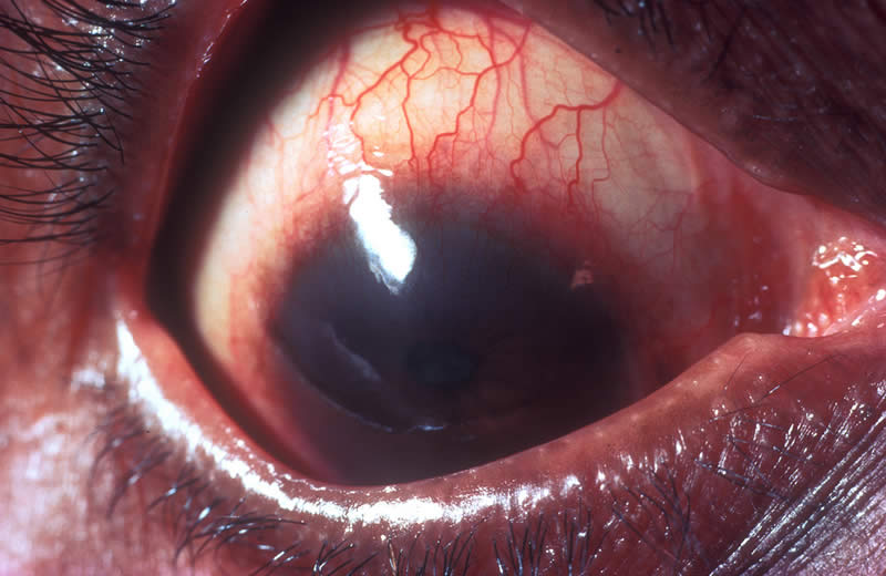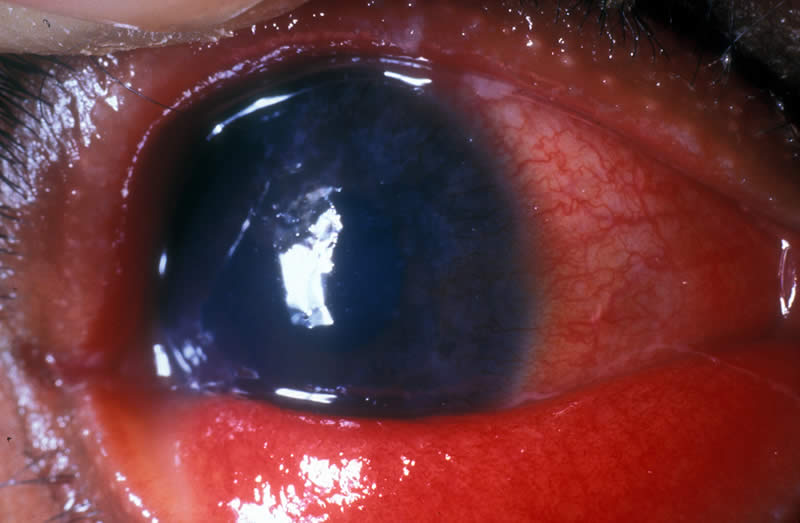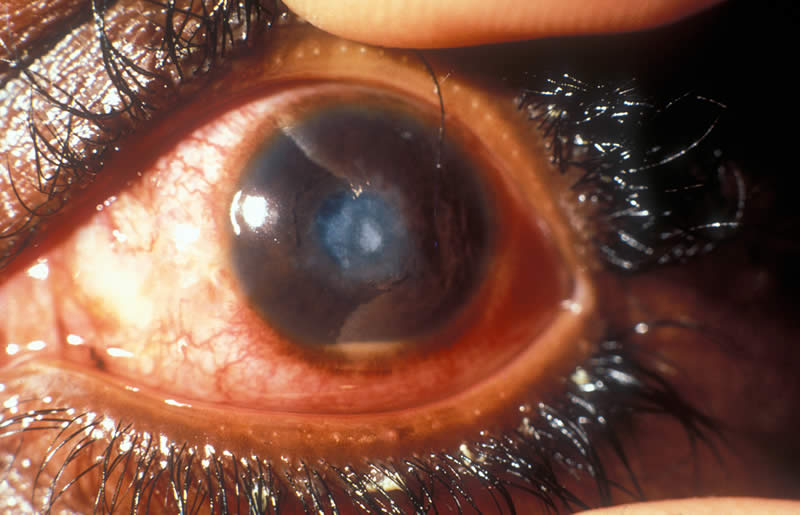 There has been a penetrating wound of the cornea and black tissue is coming through the wound. The eye was hit by a sharp object. There will be varying degrees of pain and poor vision. Here the eye is remarkably ‘quiet’ – more inflammation is usually present. Some time has passed since the injury, which was caused by a thorn. Iris tissue is presenting through the corneal wound. This is a serious situation.