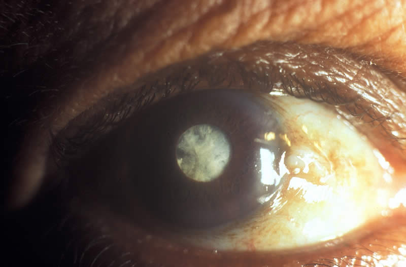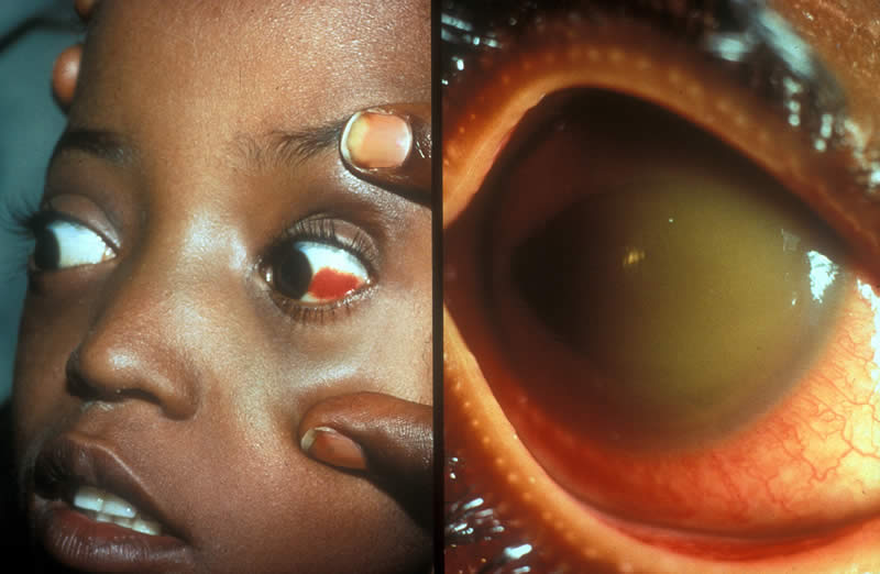 This child, in fact, had measles. The nutritional state of the child is poor. This is keratomalacia – a sudden softening of the cornea. It is the final stage of xerophthalmia, caused by lack of vitamin A in the diet.