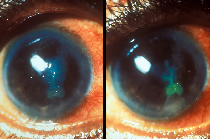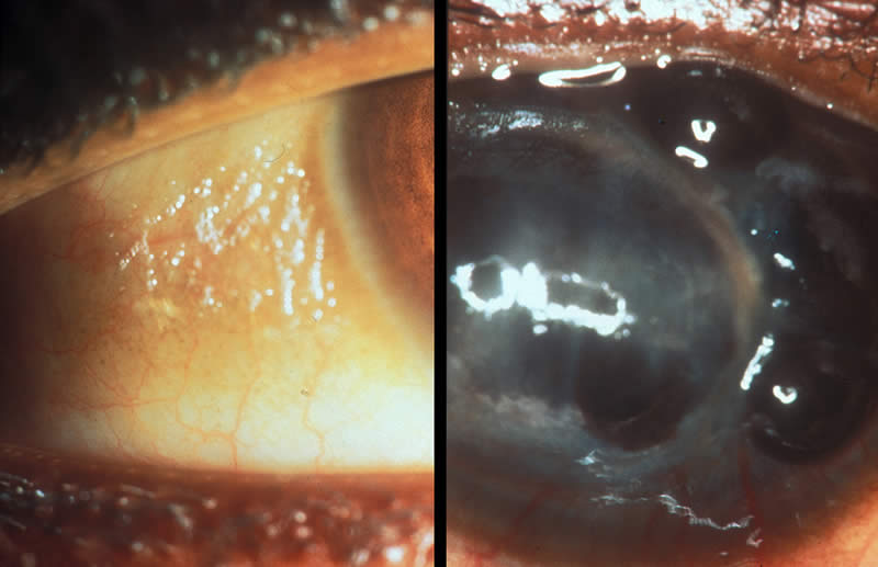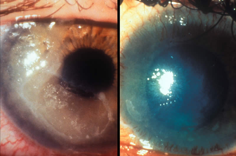 The cornea in the picture on the right is severely damaged.