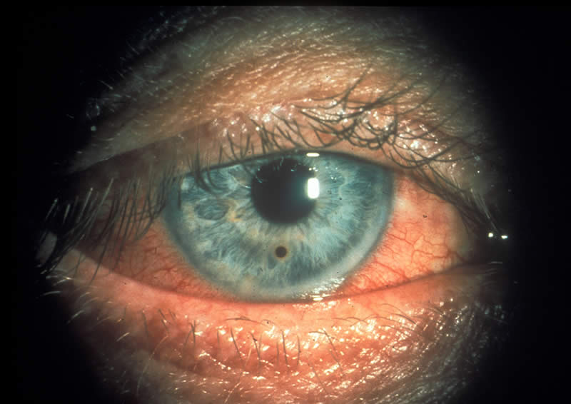 The eye is red – the conjunctiva is inflamed. The patient complains of irritation, redness and sometimes watery discharge. On examination you note that the white part of the eye (often both eyes) is red and there are many small conjunctival haemorrhages. This is epidemic haemorrhagic conjunctivitis,