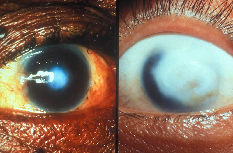 Two examples of corneal scarring are shown in these pictures. Both scars involve the central cornea and vision is, therefore, affected.