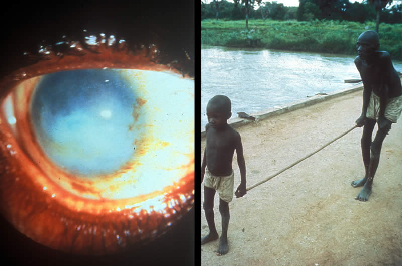 Blindness is a severe disability. The picture on the left shows severe corneal scarring, in this case caused by onchocerciasis (river blindness). The old man, pictured on the right, is blind due to onchocerciasis and needs the guidance of a child.