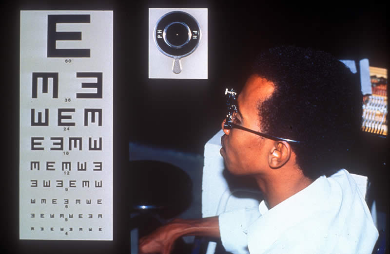 A quick test to decide whether spectacles will or will not improve vision is the pin-hole test. Make a tiny opening in some cardboard or opaque plastic and ask the patient to look, one eye at a time, at an eye chart 6 metres distant. If looking through the tiny hole improves the visual acuity when compared with looking without the pin-hole, the patient should benefit from spectacles for distance vision. Refer to a colleague who can test for spectacles.