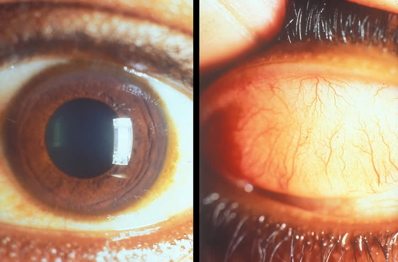 On the left is pictured typical vernal kerato-conjunctivitis in the region of the limbus (corneo-scleral margin).