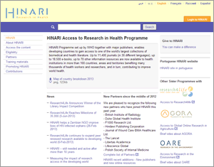 The Access to Research Initiative (HINARI) provides not-for-profit institutions in low- and middle-income countries with free or very low cost access to biomedical and social science journals. All staff members and students at the qualifying institutions are entitled to access the journals. Publisher: World Health Organization and partners