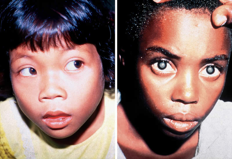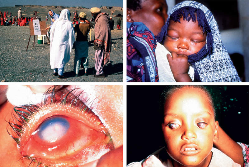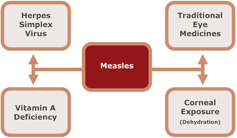In Africa, measles infection can precipitate vitamin A related corneal ulceration, whereas in Asia this is often associated with diarrhoea. Cataracts are also important in Africa and Asia.