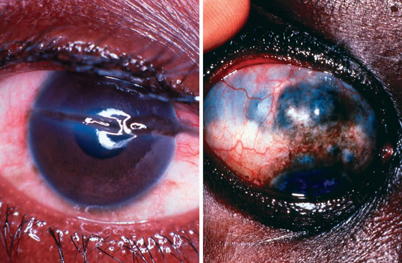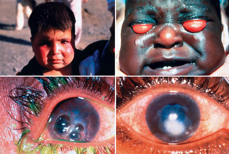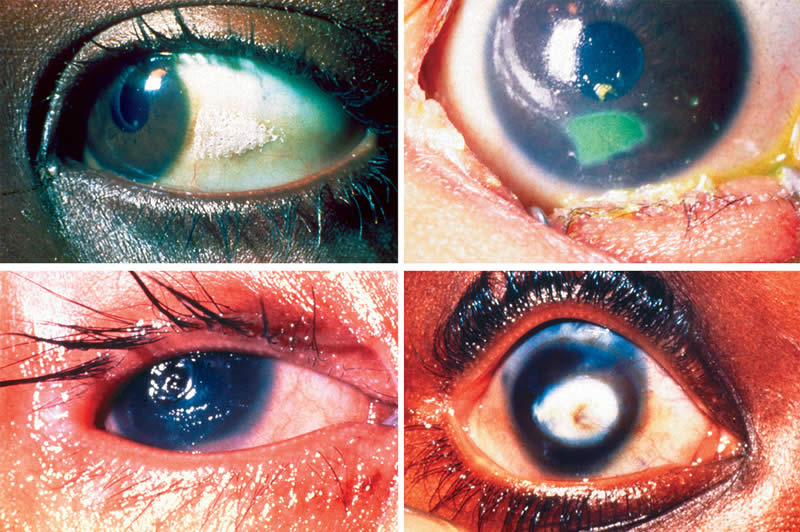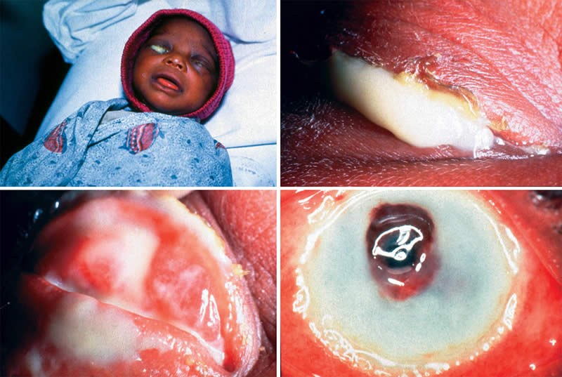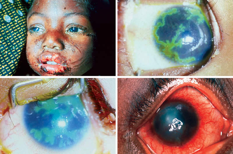 Corneal ulceration/keratomalacia (X3B): This is the consequence of severe vitamin A deficiency. The onset is often sudden, and the cornea may melt very quickly, even over a few hours (keratomalacia). This development is most often seen in young children. The child shown bottom left has deep corneal ulceration progressing towards keratomalacia.
