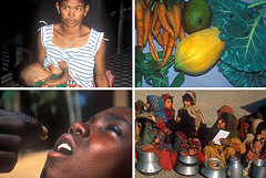 Encourage the planting of small gardens with advice as to which fruits and vegetables should be grown. Examples are shown top right – mango, papaya, dark green leafy vegetables and carrots.