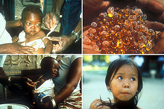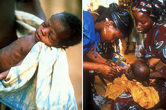The child shown top left has corneal scarring. Measurement of the upper arm circumference is a very good method of assessing the nutritional status of a child aged between one and 6 years. Long term prevention of vitamin A deficiency requires education of communities on what to grow and what to eat. Measles immunisation (bottom left) will also help to prevent vitamin A deficiency within communities.