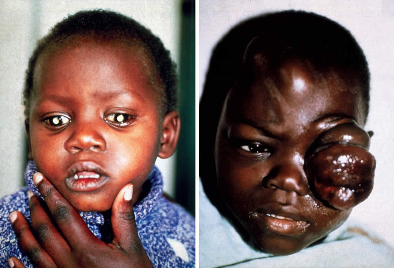 Look at the picture of the child on the left. At first sight the appearance is similar to the child with congenital cataracts. Closer examination of this child would reveal that the white reflex is caused by tumour tissue behind the lens of each eye. The picture on the right shows a more advanced tumour which has destroyed the eye; the tumour is filling the orbit and extending forward. When the tumour has extended outside the eye the prognosis for survival is much worse.