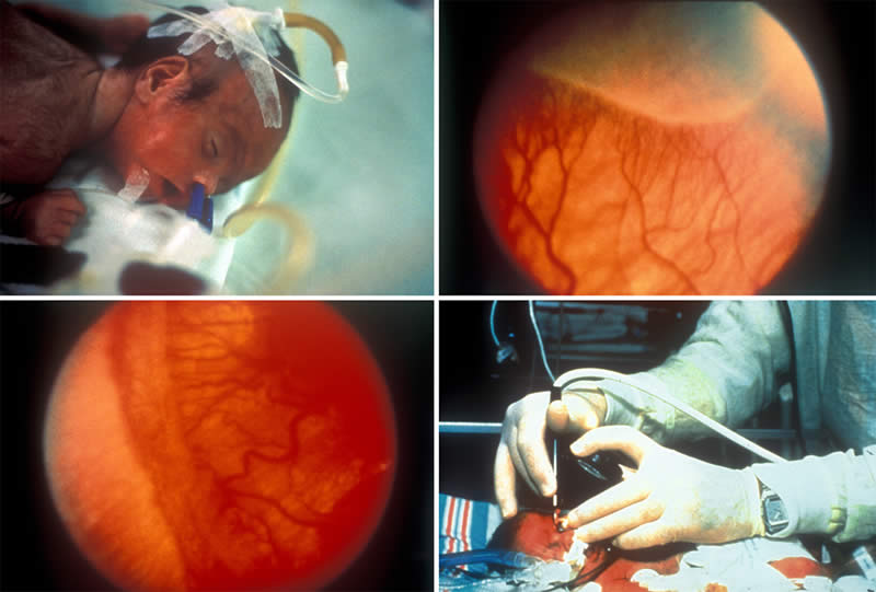 Retinopathy of prematurity occurs when the immature, developing retina is exposed to too much or fluctuating levels of oxygen, as occurs when unmonitored or poorly controlled supplemental oxygen is given to premature or low birth weight babies (top left).
