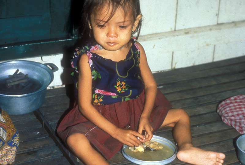 A typical child at risk of corneal blindness is a child who is one to 3 years old, no longer breast fed, who receives a poor diet and is malnourished, and who has developed measles (or another infection) or is suffering from diarrhoea. The child shown in the slide is malnourished and makes an unhappy picture – she is underweight, with obviously thin arms and legs. She has bilateral corneal ulceration due to vitamin A deficiency.