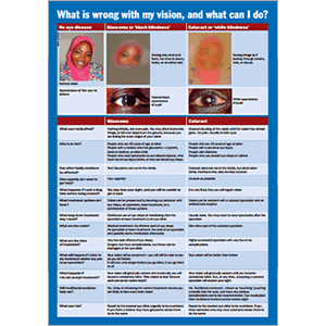 A3 size patient education poster with information and guidance on the differences between glaucoma ‘white vision’ and cataract ‘black blindness.’